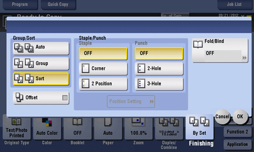[Punch] | Select binding positions when punching sheets. For details, refer to Here. |