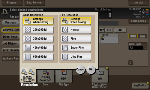 [Scan Resolution] | Select the resolution to be used for scanning and sending of the original. To use E-mail TX, SMB TX, FTP TX, or WebDAV TX, the following resolution is selected for sending.