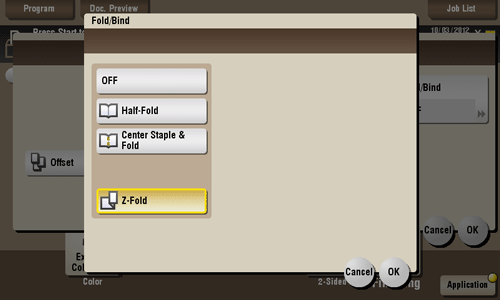 Z-folds the long side of a printed sheet before feeding it out. This option is available when printing paper of 11 17 , 8-1/2 14 , A3 , B4 , or 8K . Selecting 8-1/2 14 folds paper in two instead of Z-folding.