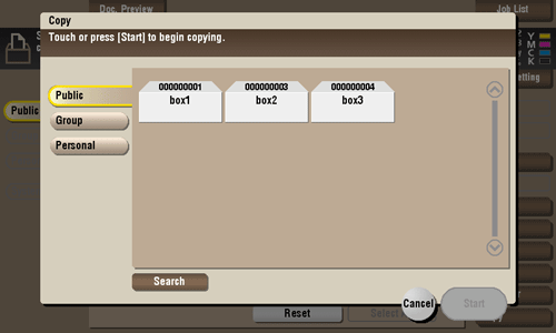 [Search] | This window is used to search for a User Box. The User Boxes are displayed based on search characters you have specified during box registration. You can also specify a User Box number directly from the Keypad. To display the Keypad, tap the input area for the numeral. |
