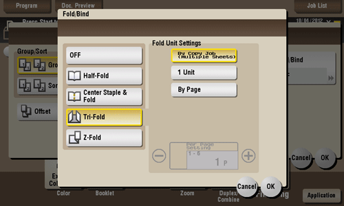 Feeds out a printed sheet by folding it in three. Also select the unit by which the paper is folded from [By Copy Job (Multiple Sheets)], [1 Unit], and [By Page]. When you set [By Page], specify the number of pages to be folded at one time.