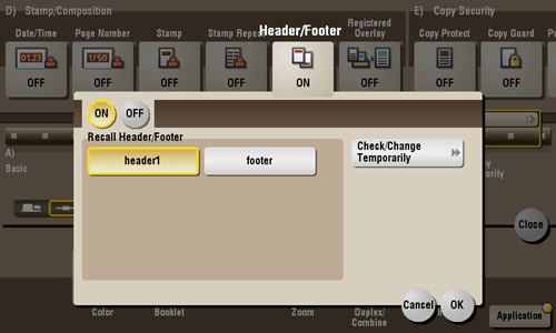 Add the date, time and any other desired text in the top and bottom margins (header/footer) of the specified page. You must register the information to be added for the header and footer in advance on this machine.