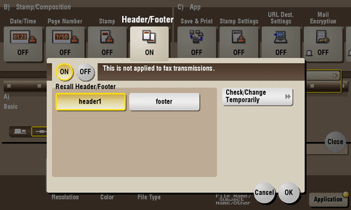 Add the date, time and any other desired text in the top and bottom margins (header/footer) of the specified page. You must register the information to be added for the header and footer in advance on this machine.