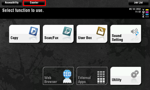 The counter indicates the total number of pages printed on this machine on a function or color basis. Check counter information on the Control Panel of this machine. When necessary, counter information can be printed in list form.