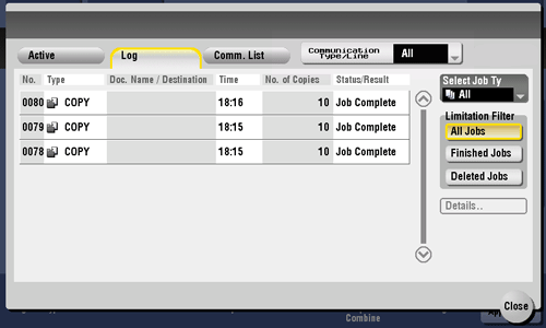 Tap [Log] to display a list of jobs processed on this machine up till then. You can check a job that could not be ended due to an error.