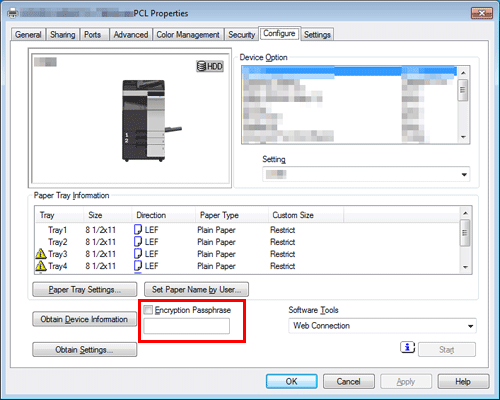 If OpenAPI communication is SSL-encrypted and the device information can be automatically obtained from the printer driver, the encrypted passphrase can be obtained from this machine. For details on how to encrypt OpenAPI communication with SSL, refer to Here.
