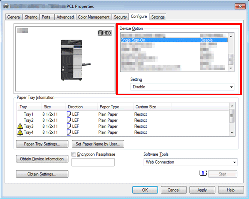 2. In [Device Option] in the [Configure] tab, check that the [User Authentication] and [Single Sign-On] settings are correctly configured for your operating environment.