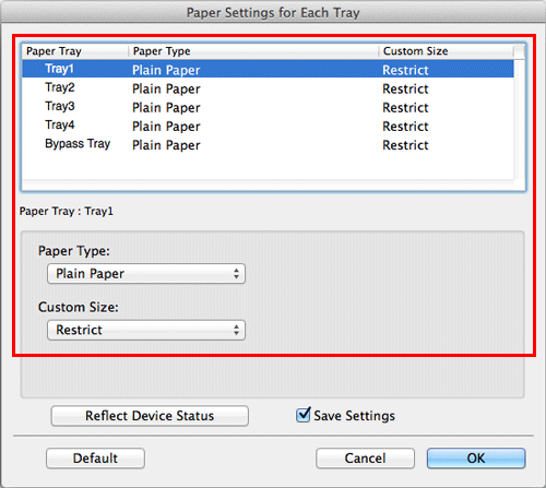 When [Paper Settings for Each Tray] is enabled on the [Installable Options] page of the printer driver, select [Paper Tray / Output Tray] - [Paper Settings for Each Tray...], and specify the paper type for each tray.
