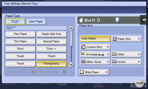Transparencies can only be printed in black. When the color function is other than black and [Transparency] is selected, check the displayed message, and tap [Yes].