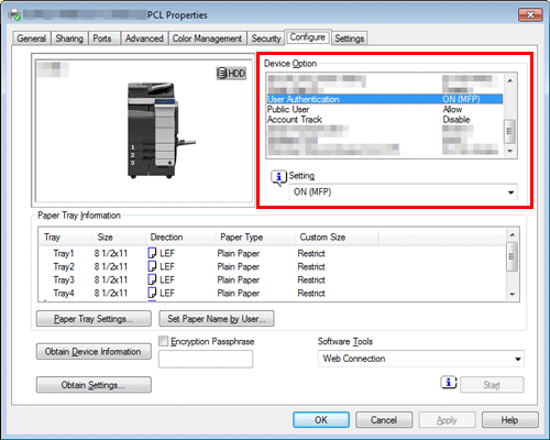 2. In [Device Option] in the [Configure] tab, check that the User Authentication/Account Track setting is correctly configured for your operating environment.