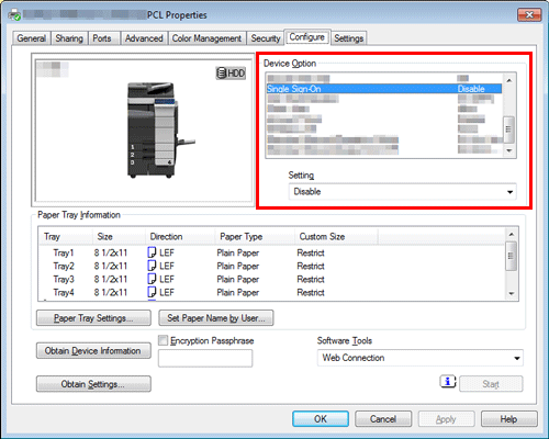 2. In [Device Option] in the [Configure] tab, check that the [User Authentication] and [Single Sign-On] settings are correctly configured for your operating environment.