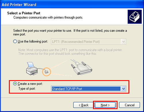 Click [Create a new port:], then select [Standard TCP/IP Port] as the [Type of