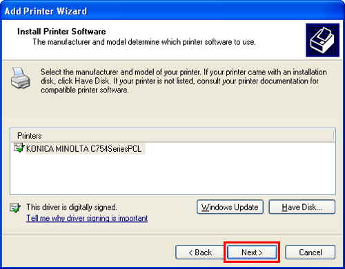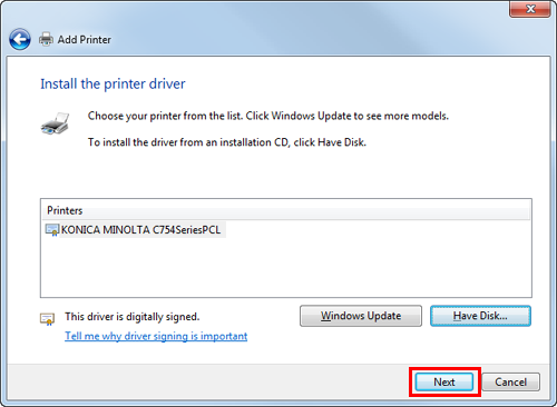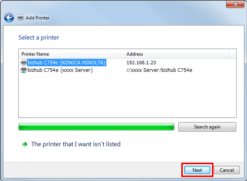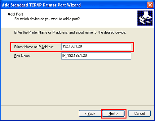 In the [Printer Name or IP Address:] box, enter the IP address for the machine, and then click [Next >].