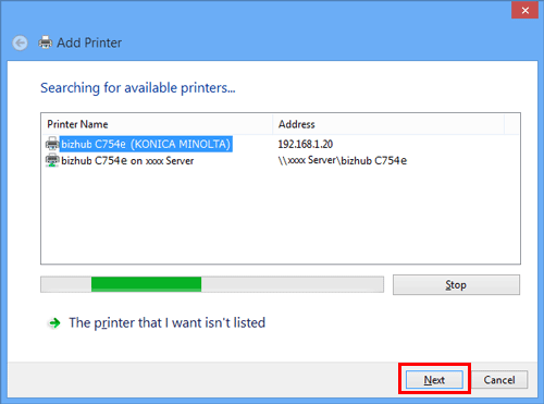 In the window showing the detected printer, click [The printer that I want isn't listed].