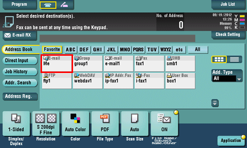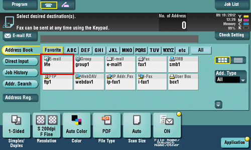 By selecting the [Me] key displayed in the [Address Book] screen, you can send E-mails to your E-mail address. If you log in to this machine that provides user authentication, the [Me] key appears in the [Address Book] screen. The [Me] key is assigned to an E-mail address of the login user. To use this function, you do not have to register your E-mail address in the address book.