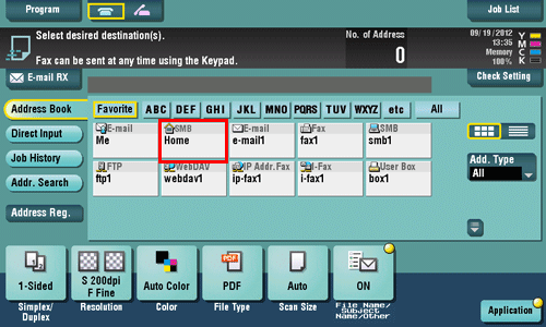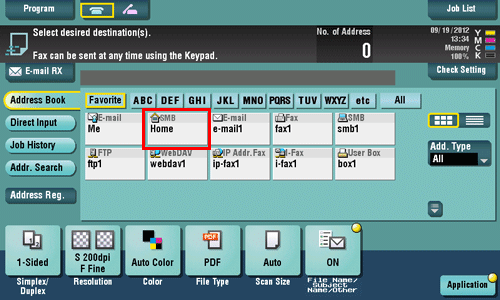 To send scanned original data to a shared folder on the server or your computer, select the [Home] key.