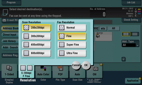 [Scan Resolution] | Select the resolution of the original for scan transmission. When using Scan to E-mail, SMB Send, FTP Send, WebDAV Send, or Save in User Box, select the following resolution to scan an original.