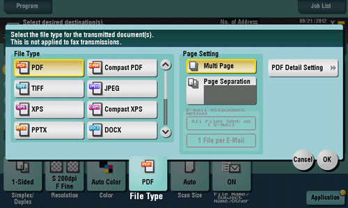 [PDF Detail Setting] | If [PDF] or [Compact PDF] is selected for file format, you can configure the PDF option settings. You can enhance security by attaching a digital signature that identifies the author of the file, by file encryption, etc. For details, refer to Here. |