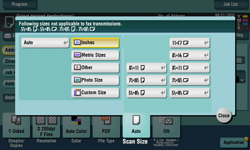 [Inches] | Select this option to scan an inch-size original. Tap [Inches], and select a standard inch size. |