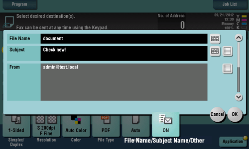 When sending by E-mail, you can specify the subject and text of the E-mail message and change the sender E-mail address ("From" address).