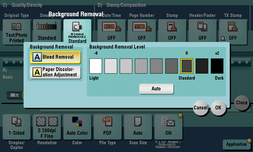 [Background Removal Level] | Tap this button to adjust the density of the background color for an original that has a colored background. Selecting [Auto] automatically determines the density of the background color, and scans an original at the optimum background density level. |