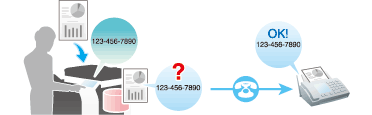 The Check Dest. & Send function checks the fax number specified for the fax transmission against the destination fax number (CSI) and sends the fax only when they match.