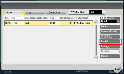 Pending jobs for resending are resent automatically after a certain period of time has elapsed using the auto redial function. However, you can manually resend the fax.