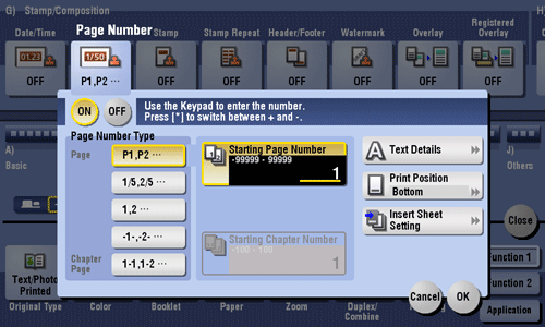Enter the starting page number to be printed on the first page using the Keypad. To display the Keypad, tap the input area for the numeral. For example, to print page numbers from the third page of the original, enter "-1". The first page of the original is counted as "-1", and the second page as "0", and the third page is counted as "1". In [Starting Page Number], a page number is printed on pages 1 and later. If "2" is entered, page numbers are printed from the first page of the original as "2, 3", etc. in order. The "-" (minus sign) changes to + each time you tap [*].