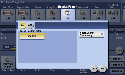 Add the date, time, and any arbitrary text in the top and bottom margins (header/footer) of the specified page. You must register the information to be added to the header and footer on this machine in advance.