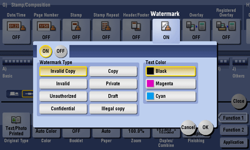 • Part of the watermark may be lost depending on the paper size, such as A6 and B6. In this case, the machine automatically cancels the watermark function for copying.