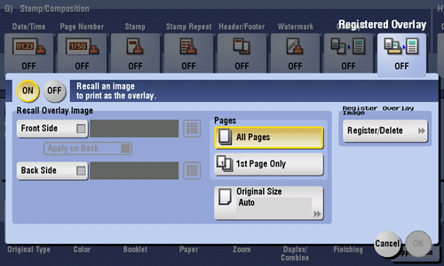 Select [ON] to register a new overlay image or compose a registered overlay image on the original.