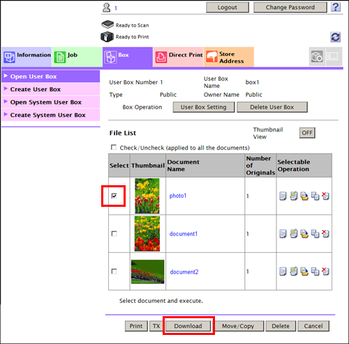 Using Web Connection allows you to download files in the Public User Box to a computer. For details, refer to Here.