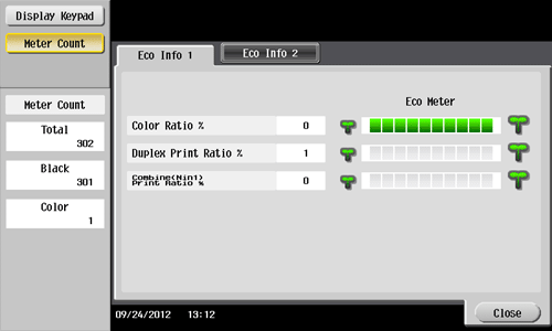 The counter also allows you to check the ratio of color print jobs to all print jobs, the ratio of paper saving as a result of two-sided printing or the page combine function, a transition of power consumption (Eco Info), and other values, depending on user's operation conditions. This information will help you gain an understanding of the usage status of this machine.