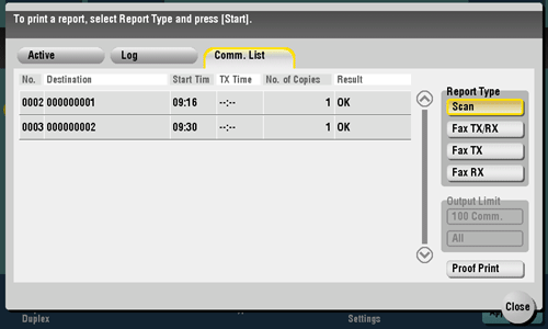 Tap [Comm. List] to print a fax report that contains the results of Scan, Fax TX, Fax RX, and fax communication (TX/RX) jobs. For a fax report, you can specify the number of destinations.