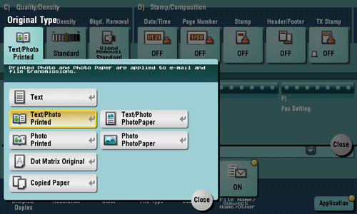 [Copied Paper] | Tap this button to scan originals containing uniform density and that are printed on copier or printer, at the optimum level of image quality. |