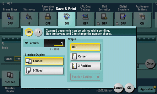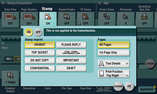 Select the stamping position and representation, and add the date and time the original is scanned. The date and time can either be printed on all pages or only on the first page.