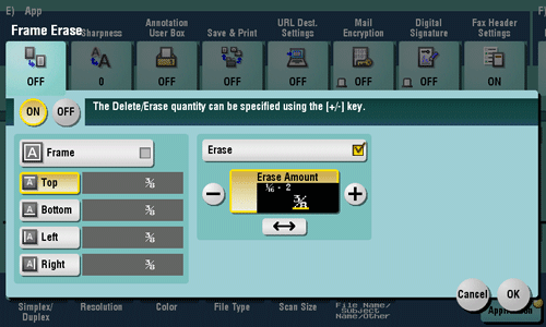 [Top]/[Bottom]/[Left]/[Right] | Select this option to erase the four sides of the original to different widths. Clear the [Frame] check box, select a side ([Top], [Bottom], [Left] or [Right]) and specify the width of the area in [Erase Amount] by tapping [+]/[-] for an inch area and by tapping [+]/[-] or Keypad for a centimeter area. To display the Keypad, tap the input area for the numeral. If you do not want to erase the side, cancel the setting for [Erase]. |