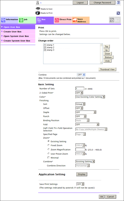 You can combine multiple files into a single file and print them at the same time. If you select multiple files and set [OFF], you cannot use the [Basic Setting] and [Application Setting] options.