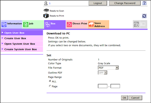 • Using Web Connection allows you to download files in the Public User Box to a computer. For details, refer to Here.