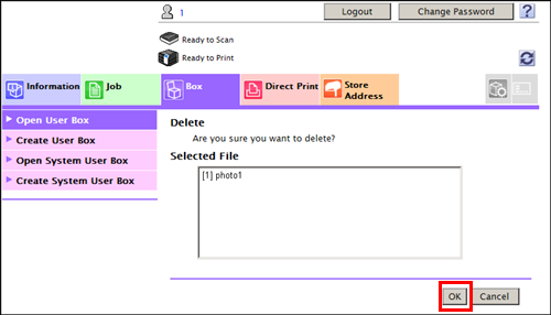 • You can specify to hold or clear a file from the box after file printing or sending (Default: [Yes]). Also, you can prompt the user to hold or not hold a file in the box after it has been printed or sent in the delete confirmation screen. For details, refer to Here.