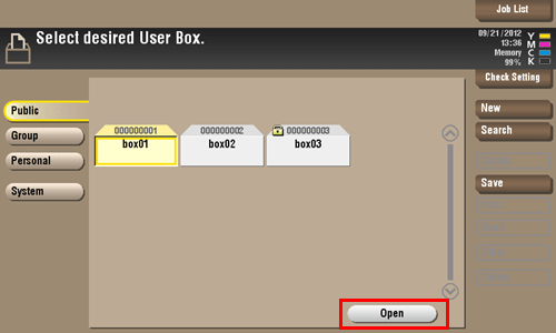 • This example uses the Public User Box for explanatory purposes. To use a Personal User Box or a Group User Box, tap [Personal] or [Group] and select the desired box.