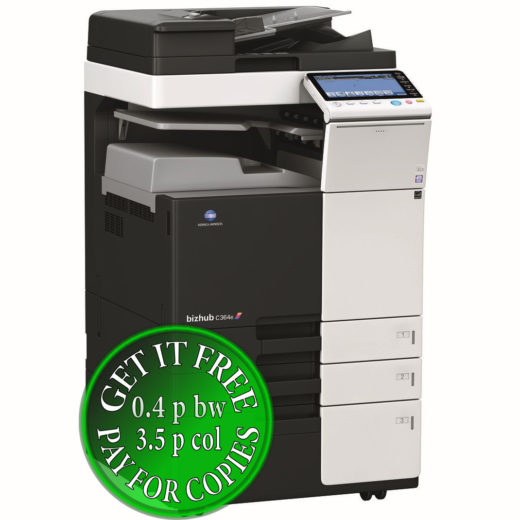 » More OffersFree Konica MinoltaBizhub C364e3.5p per colour copy0.4p per B&W copyMonthly volume:- 5000 colour, costing £175