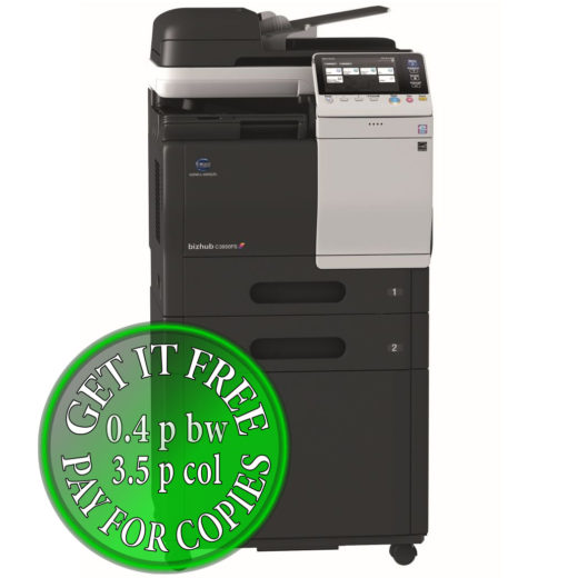 » More OffersFree Konica MinoltaBizhub C3850FS3.5p per colour copy0.4p per B&W copyMonthly volume:- 2400 colour, costing £84