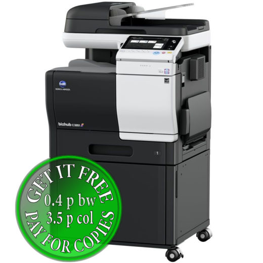 » More OffersFree Konica MinoltaBizhub C38513.5p per colour copy0.4p per B&W copyMonthly volume:- 3000 colour, costing £105